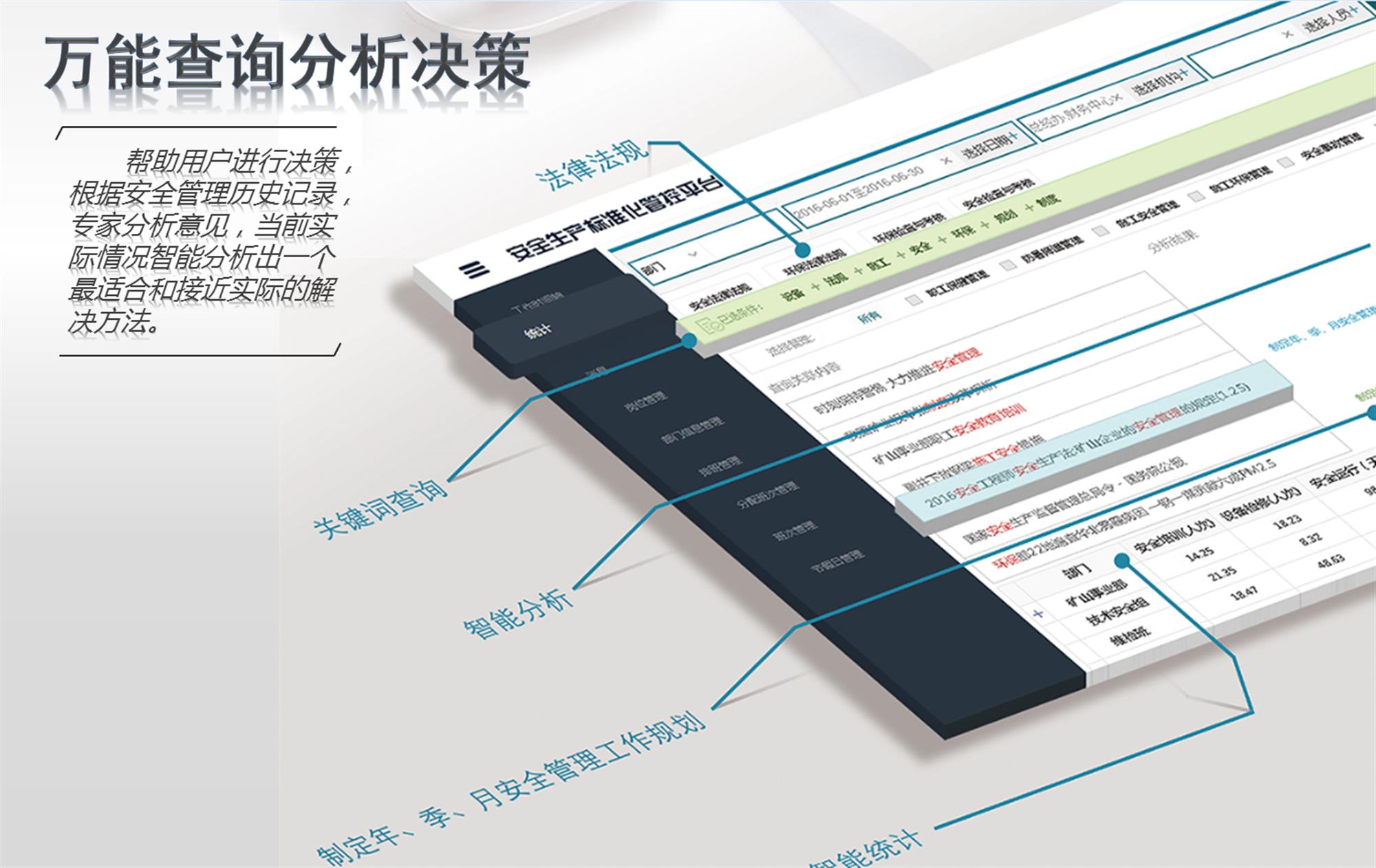 安全生產(chǎn)標(biāo)準(zhǔn)化管控平臺是遼寧聚進(jìn)科技有限公司智慧企業(yè)建設(shè)的一個重要部分;是實(shí)現(xiàn)業(yè)務(wù)規(guī)范化、過程標(biāo)準(zhǔn)化、管控智能化、績效分析自動化的行業(yè)領(lǐng)先的應(yīng)用平臺系統(tǒng);該平臺以國家安全法律法規(guī)、相關(guān)政策為基礎(chǔ),以企業(yè)崗位責(zé)任制度為參照,采用B/S應(yīng)用架構(gòu)、大型數(shù)據(jù)倉庫技術(shù)、移動終端互聯(lián)網(wǎng)開發(fā)技術(shù)、“仿真三維”數(shù)字建模技術(shù)、GIS應(yīng)用技術(shù)以及大數(shù)據(jù)挖掘技術(shù)等領(lǐng)先科研成果與技術(shù)研發(fā)而成,為企業(yè)提供自下而上的一線安全管理作業(yè)數(shù)據(jù)。